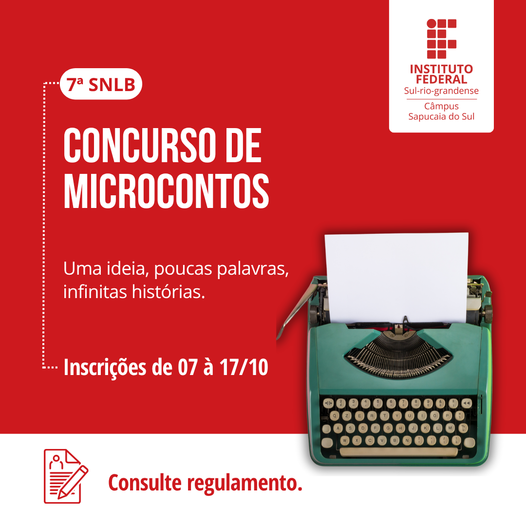 O Concurso Literário de Microcontos é uma atividade cultural promovida pela Biblioteca do Instituto Federal de Educação, Ciência e Tecnologia Sul-rio-grandense – Câmpus Sapucaia do Sul, como parte da 7ª Semana Nacional do Livro e da Biblioteca - 2025. O objetivo é incentivar a criatividade, a escrita e a leitura, promovendo a valorização da produção literária e o desenvolvimento da expressão artística. As inscrições ocorrerão de 07 à 17/10/2025. 📄 Confira o Regulamento: Clique aqui 📝 Inscreva-se no Concurso de Microcontos: Clique aqui E aqui vai uma dica: capriche no seu microconto e quem sabe você não é um dos nossos vencedores?