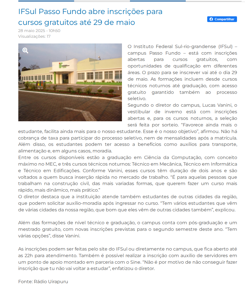 Rádio Cristalina - IFSul Passo Fundo abre inscrições para cursos gratuitos até 29 de maio