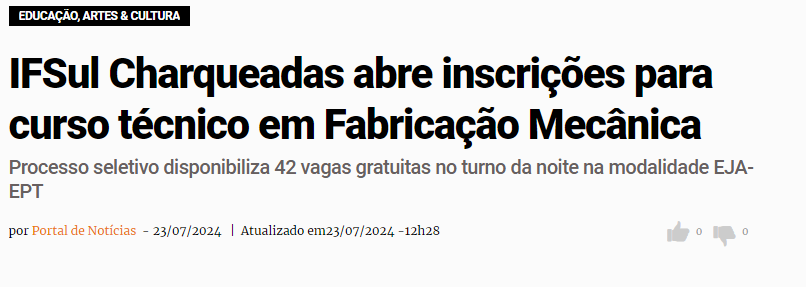 Portal de Notícias - IFSul Charqueadas abre inscrições para curso técnico em Fabricação Mecânica