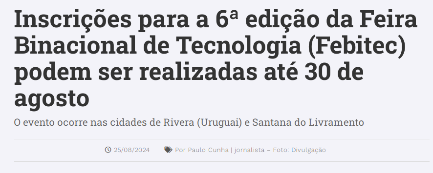 Portal de Camaquã - Inscrições para a 6ª edição da Feira Binacional de Tecnologia (Febitec) podem ser realizadas até 30 de agosto