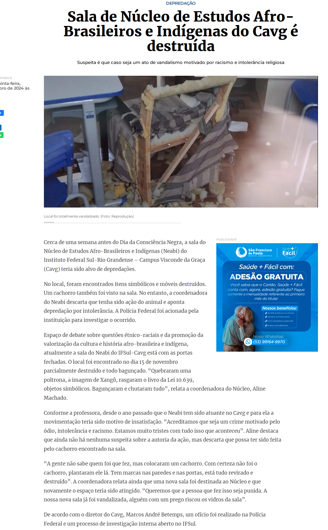 A Hora do Sul - Sala de Núcleo de Estudos Afro-Brasileiros e Indígenas do Cavg é destruída