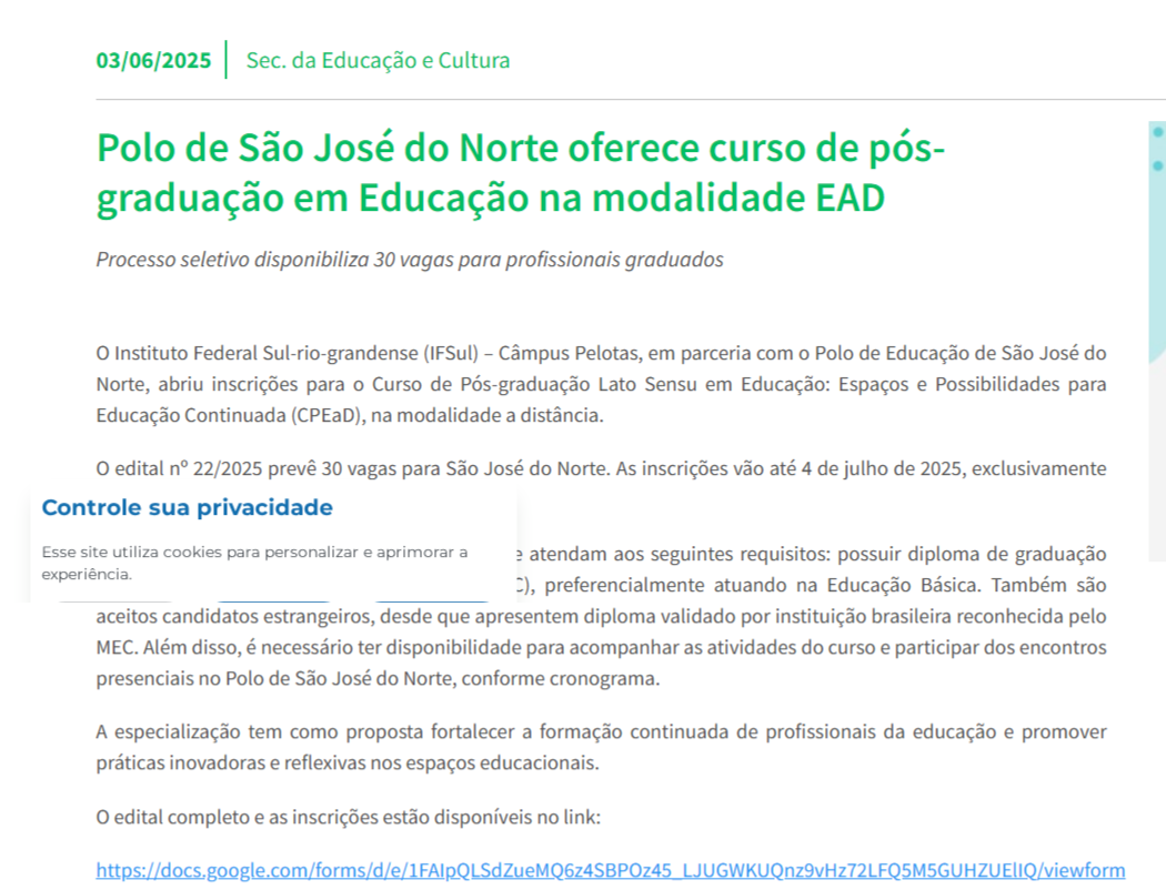 Prefeitura de São José do Norte - Polo de São José do Norte oferece curso de pós-graduação em Educação na modalidade EAD