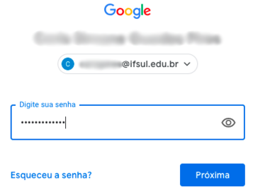 Passo 2: Você será direcionado para a página de autenticação. Informe sua senha e clique em “próxima”. Para servidores, a senha será o número do Siape; para os estudantes, a senha será a matrícula.