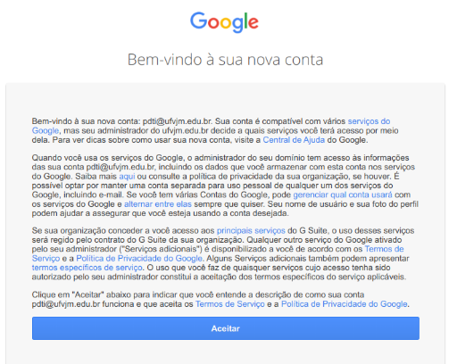 Passo 3: Caso seja o seu primeiro acesso, você verá a tela “Bem-vindo à sua nova conta” e deverá ler e aceitar os Termos de Serviço e Política de Privacidade do Google.