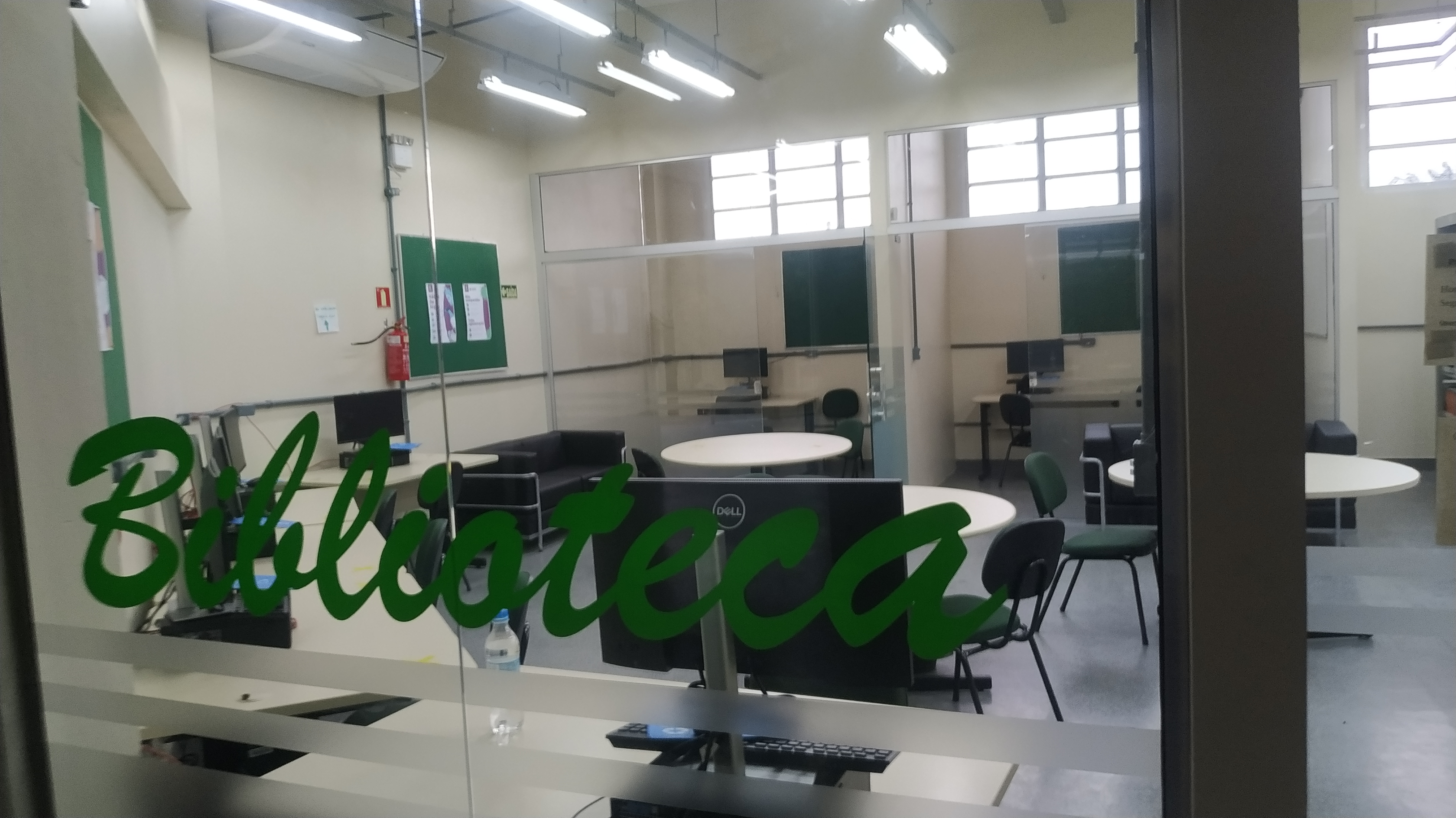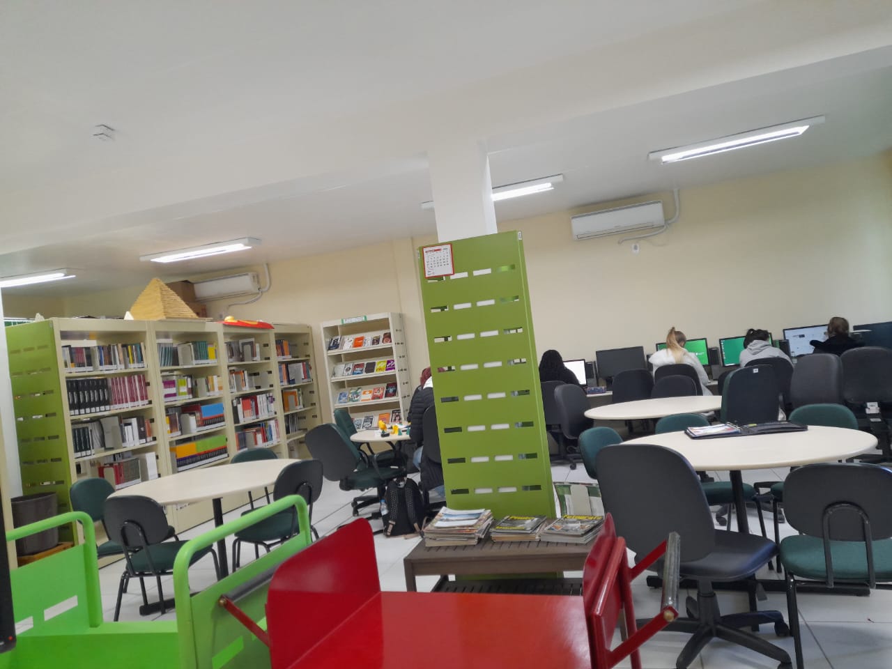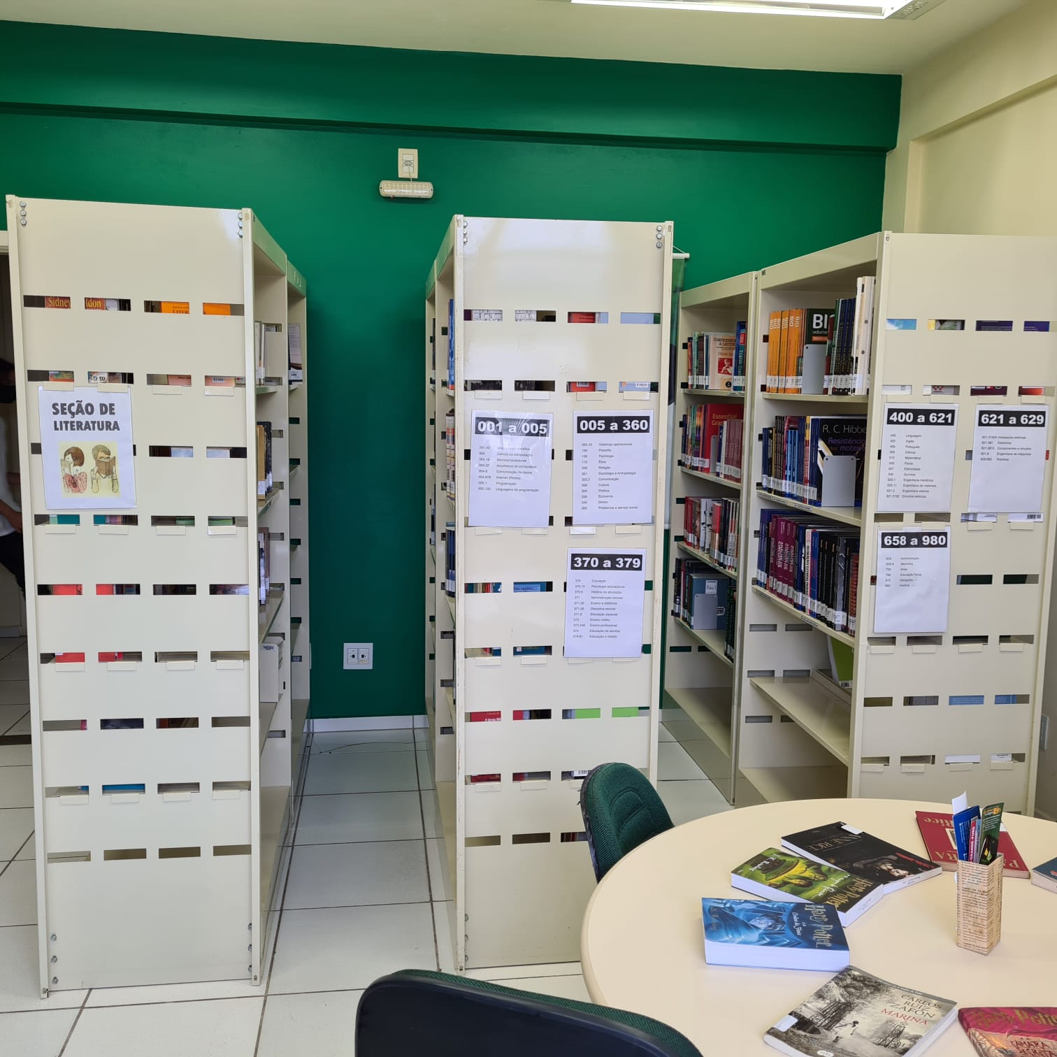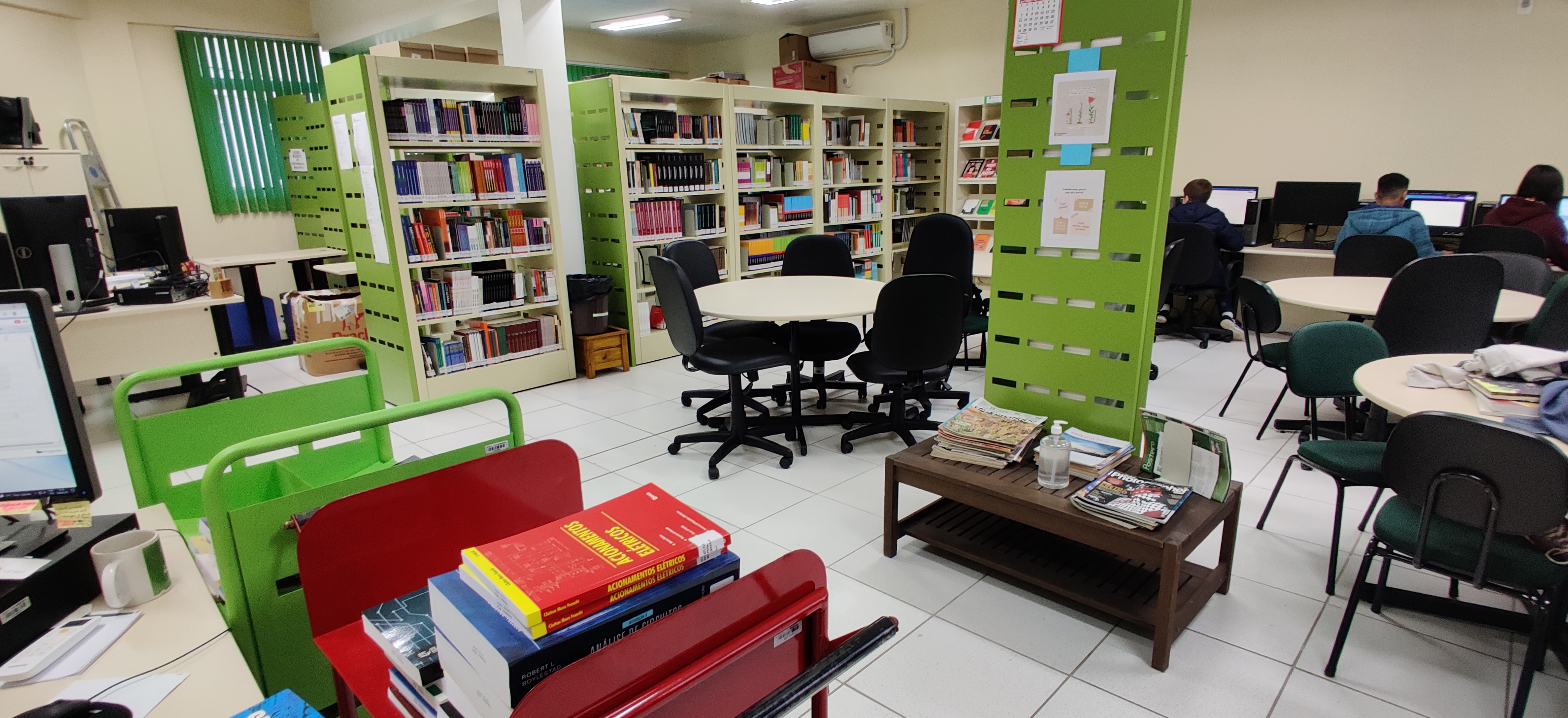 A Biblioteca está localizada no Bloco 3 e ocupa um espaço de 290 m².