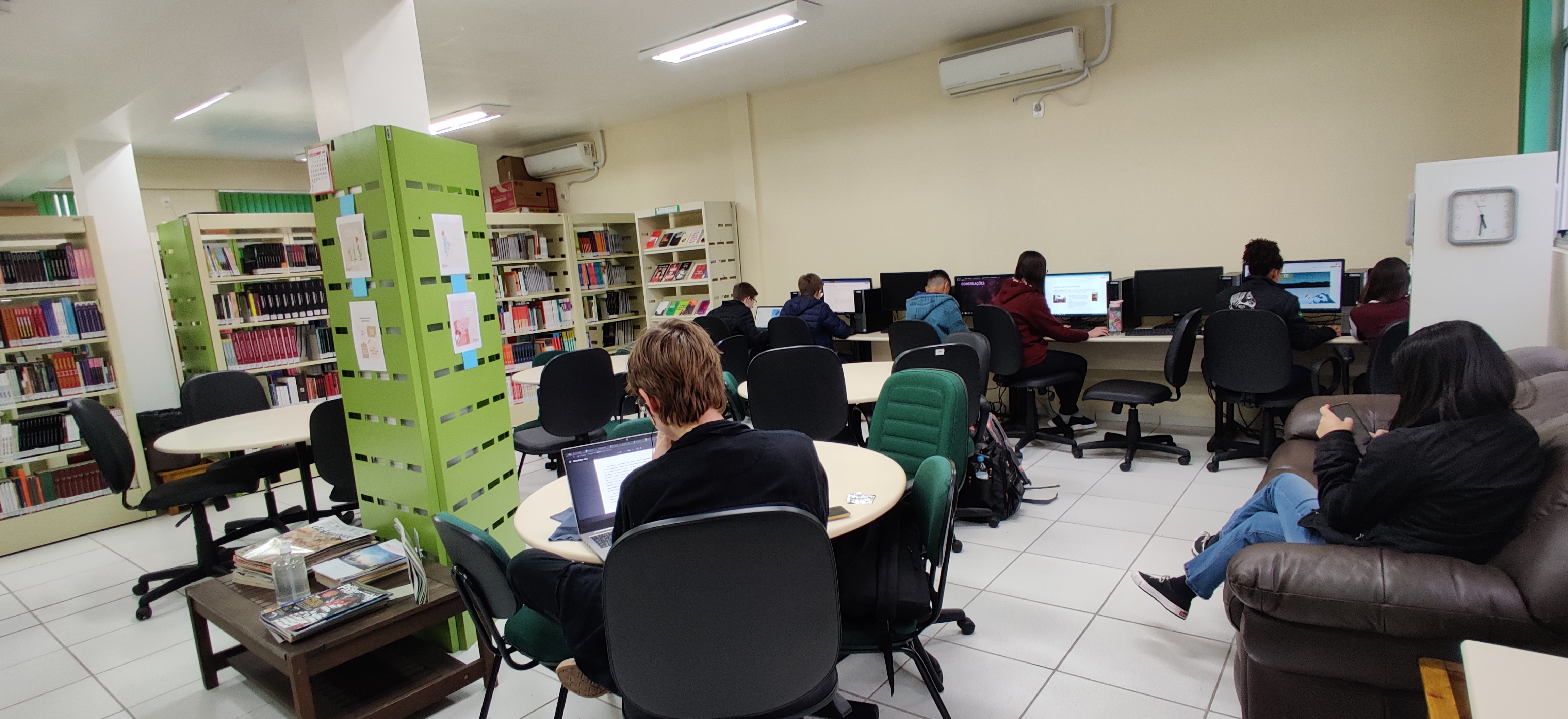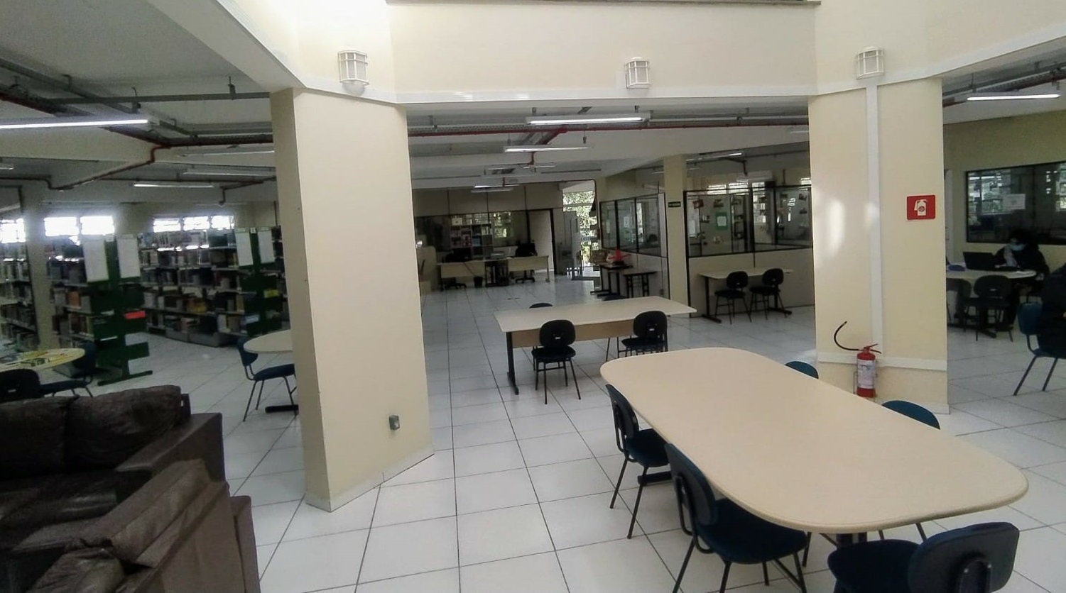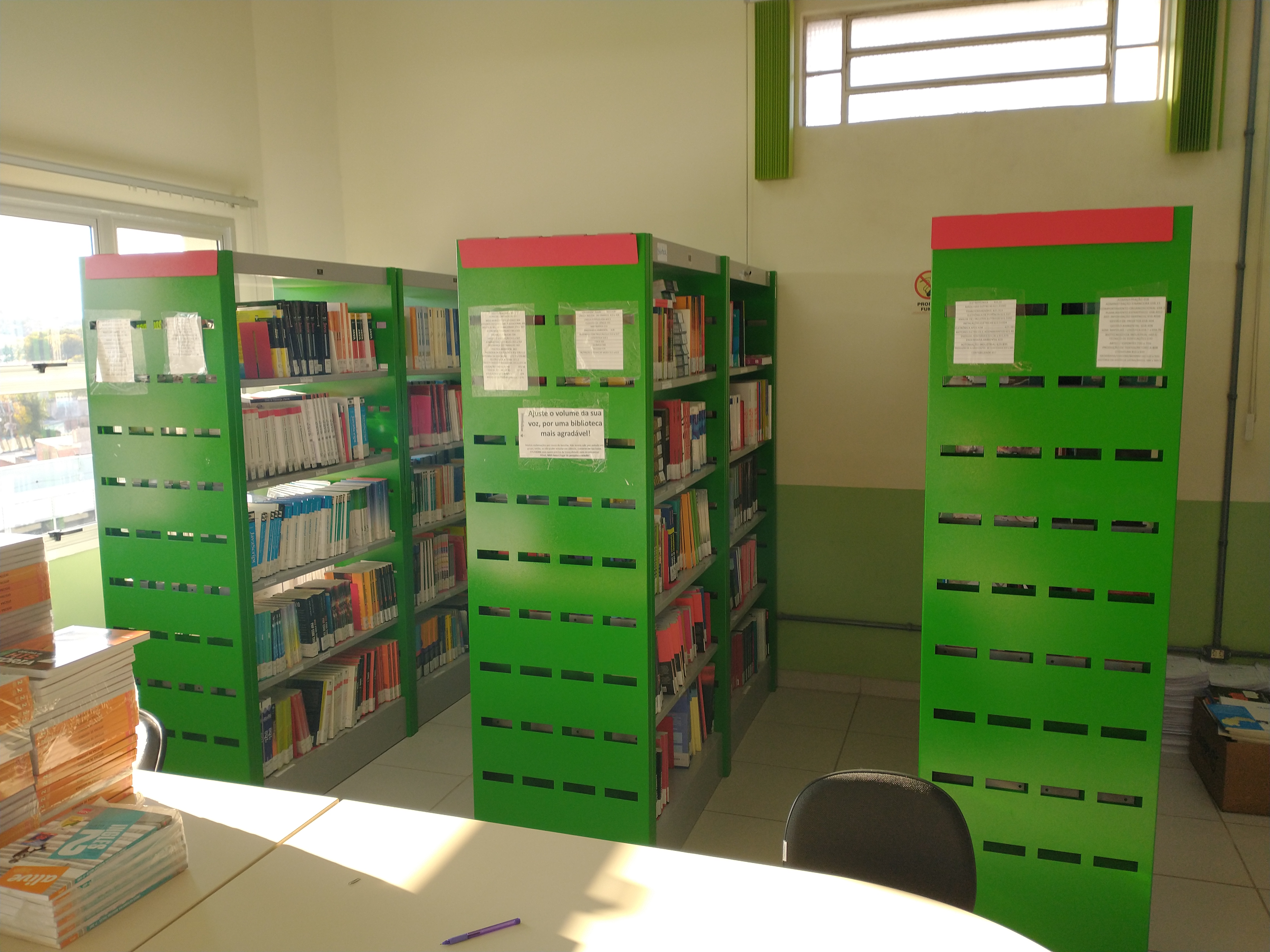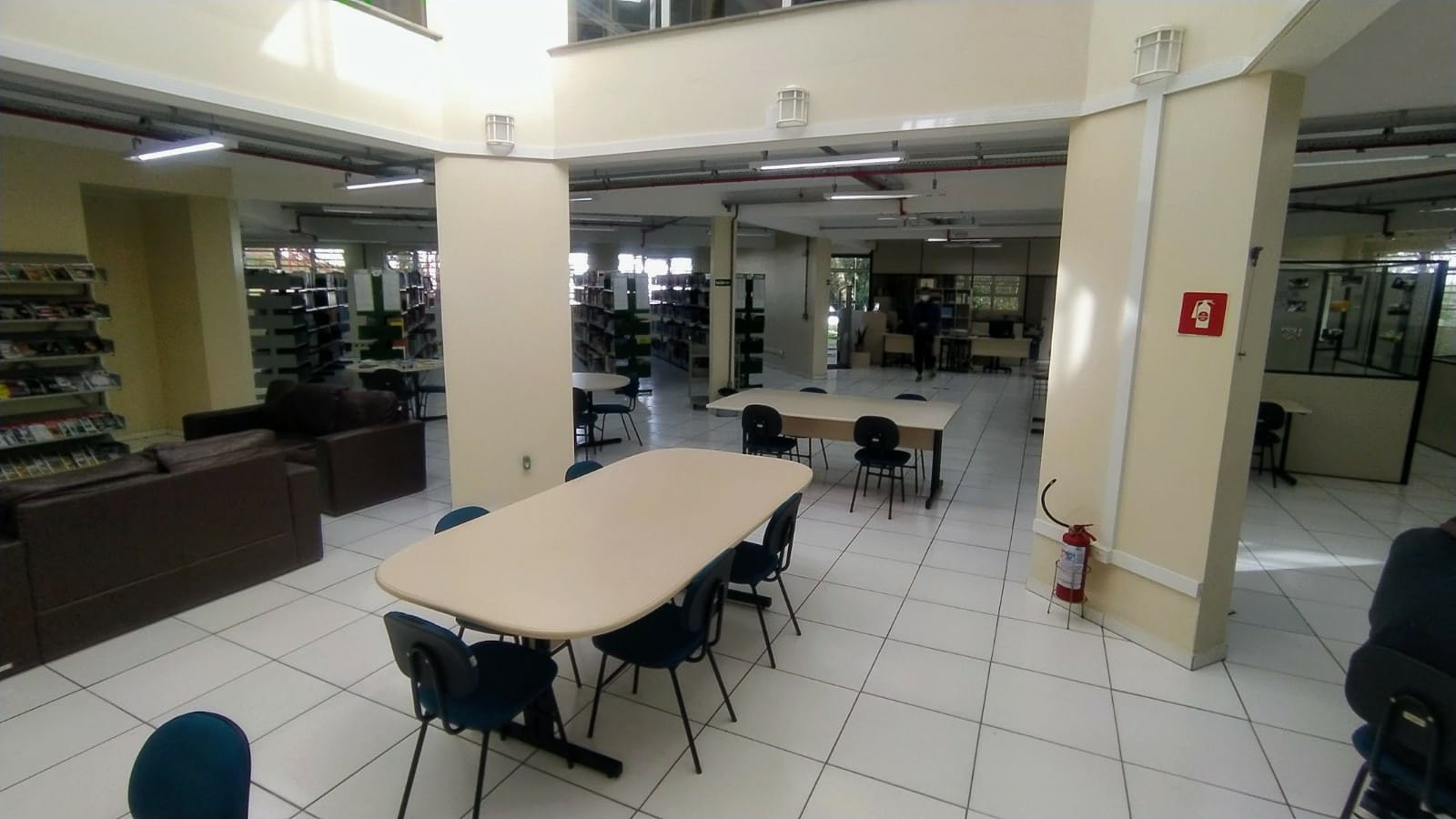 A Biblioteca está localizada no Bloco 3 e ocupa um espaço de 290 m².