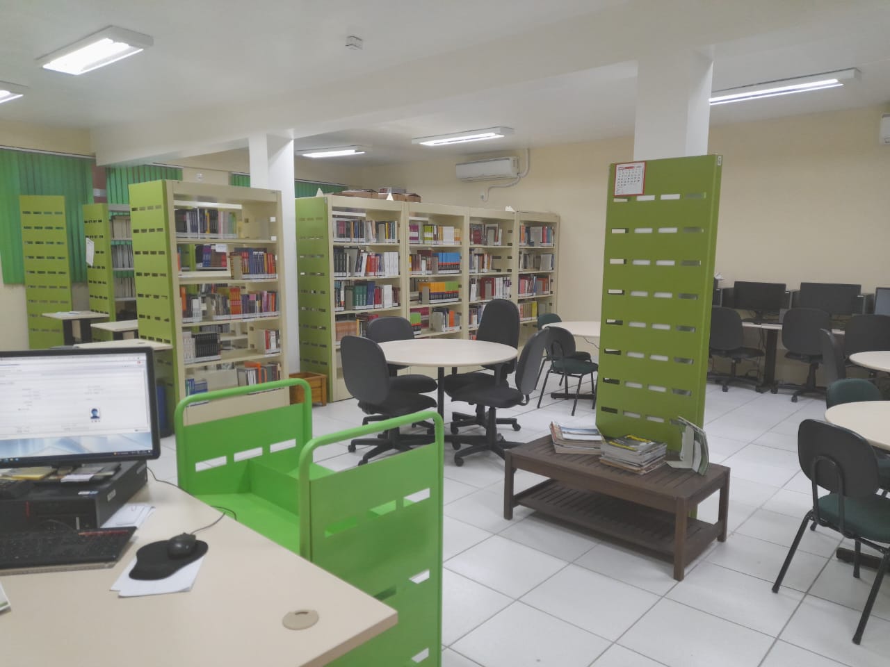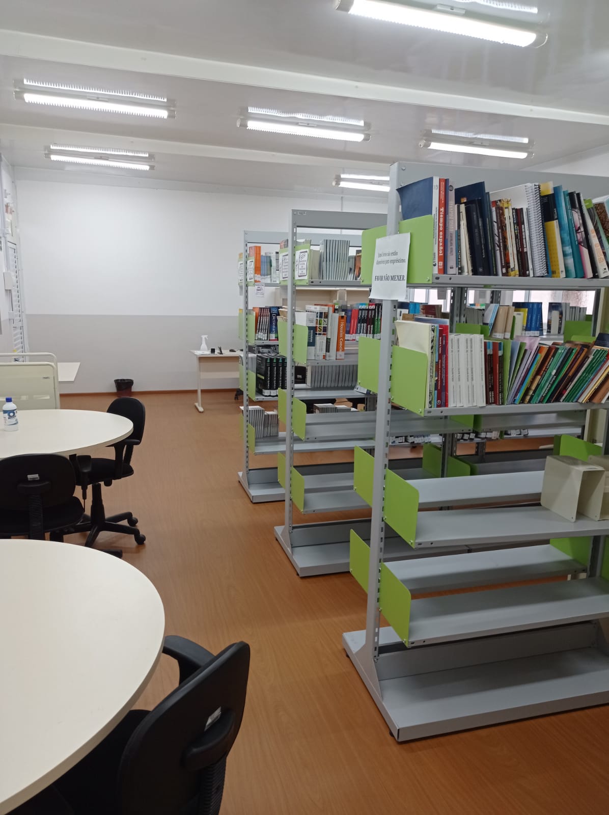 Entre 2018 e 2020 a biblioteca ocupava uma sala de 28,61m2, com apenas 5 estantes de livros. Em 2021 a biblioteca passou a ocupar uma sala com 56,27m2, com 10 estantes de livros e 7 computadores para utilização pelos usuários. Em 2022 a biblioteca passou a ocupar um novo espaço, com 94,52m2, 15 estantes de livros, 1expositor, 8 computadores, em bancadas para estudo individual, e 4 mesas para trabalhos em grupo.