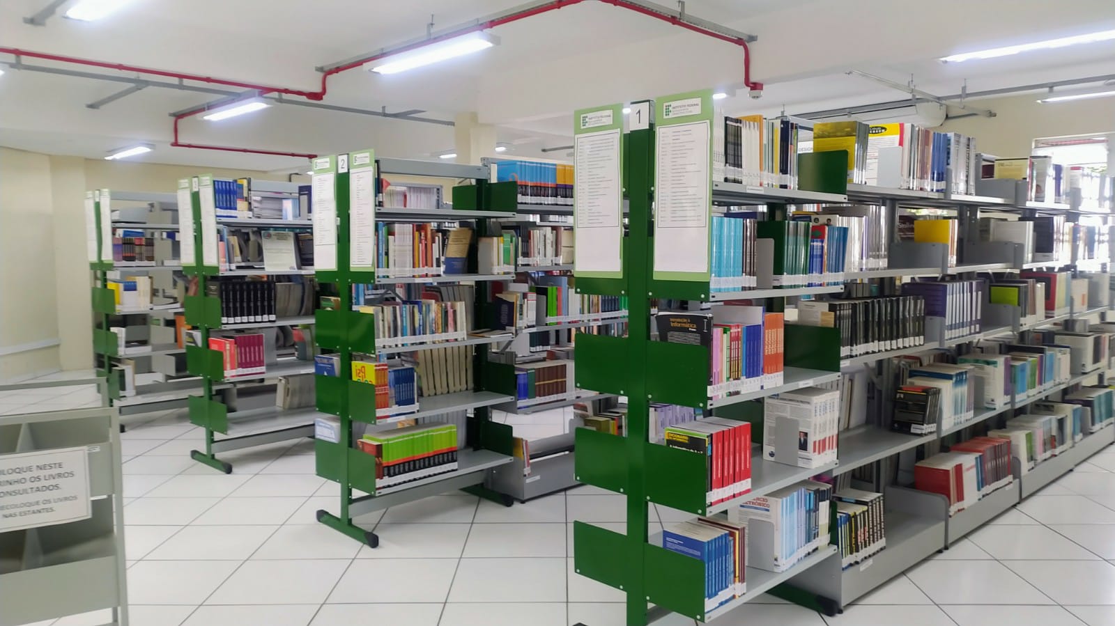 A biblioteca está localizada no bloco administrativo e ocupa um espaço de 95 m².