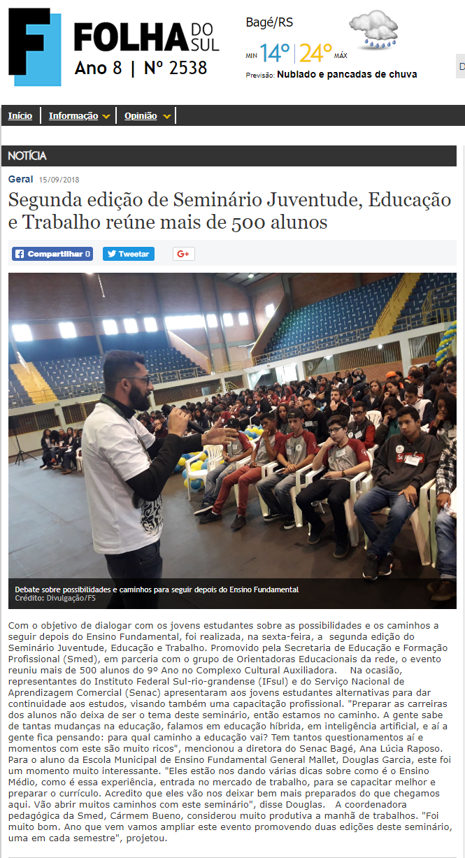 Folha do Sul - Segunda edição de Seminário Juventude, Educação e Trabalho reúne mais de 500 alunos
