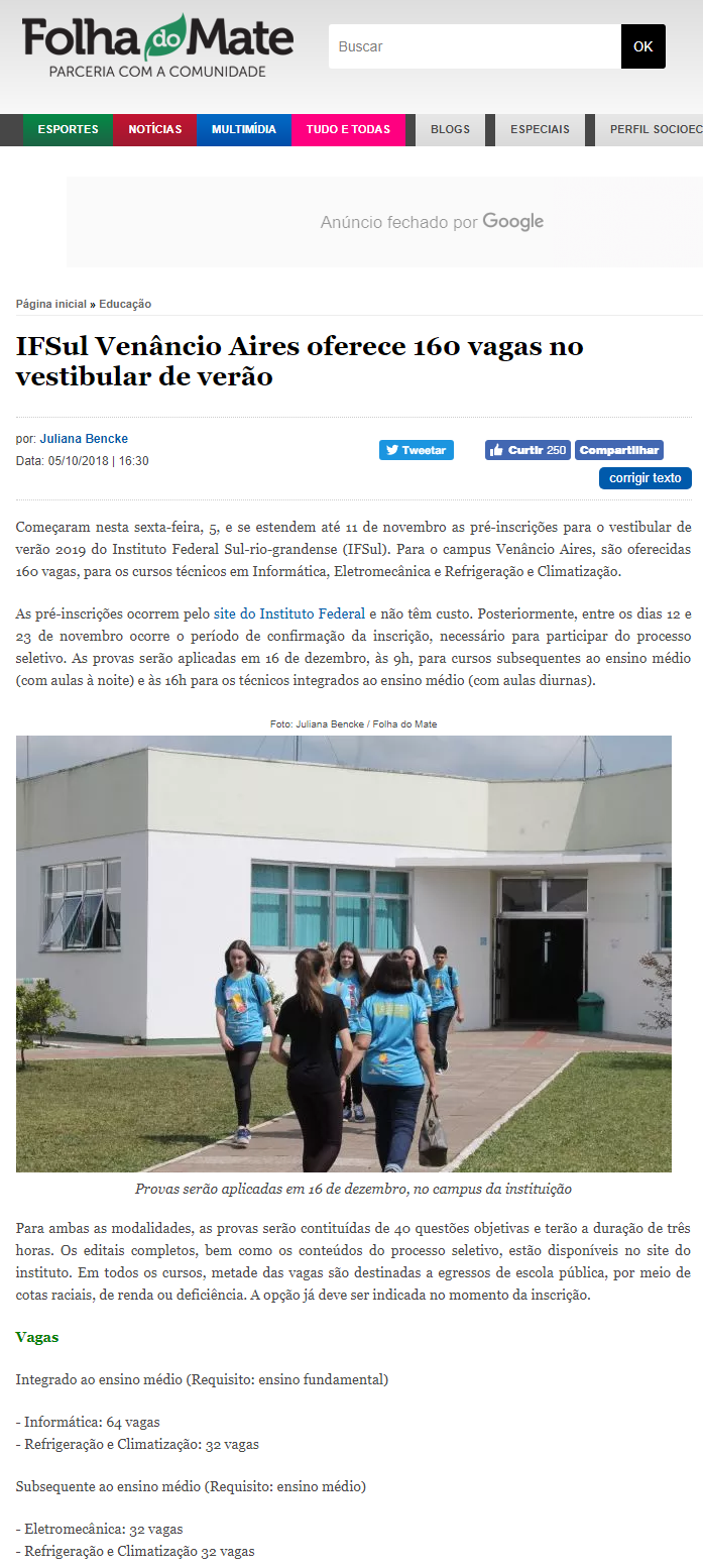Folha do Mate - IFSul Venâncio Aires oferece 160 vagas no vestibular de verão
