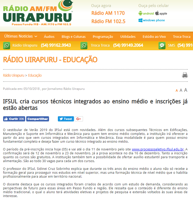 Rádio Uirapuru - IFSul cria cursos técnicos integrados ao ensino médio e inscrições já estão abertas
