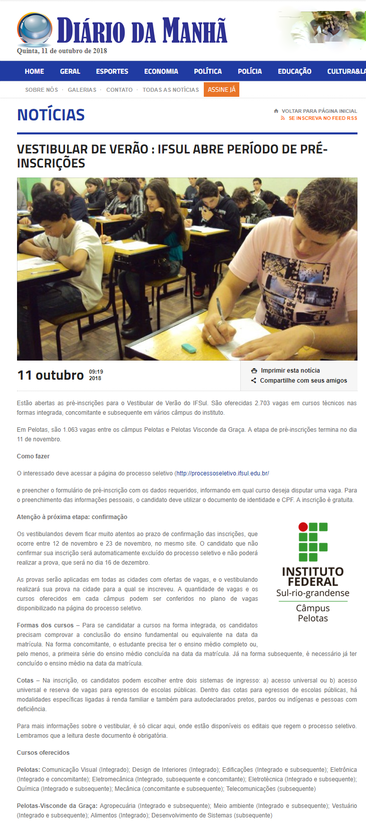 Diário da Manhã - Vestibular de Verão: IFSul abre período de pré-inscrições
