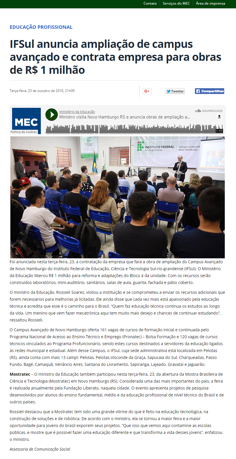 MEC - IFSul anuncia ampliação de câmpus avançado e contrata empresa para obras de R$ 1 milhão