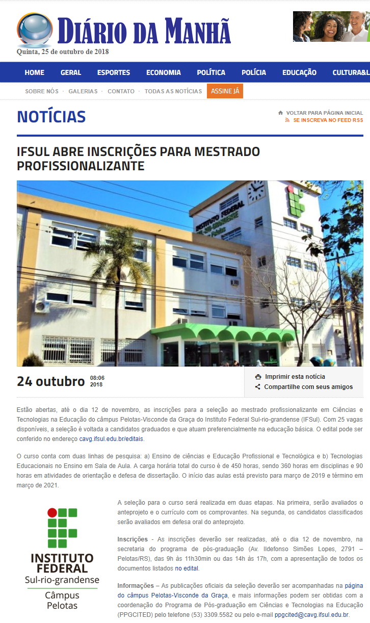 Diário da Manhã - IFSul abre inscrições para mestrado profissionalizante