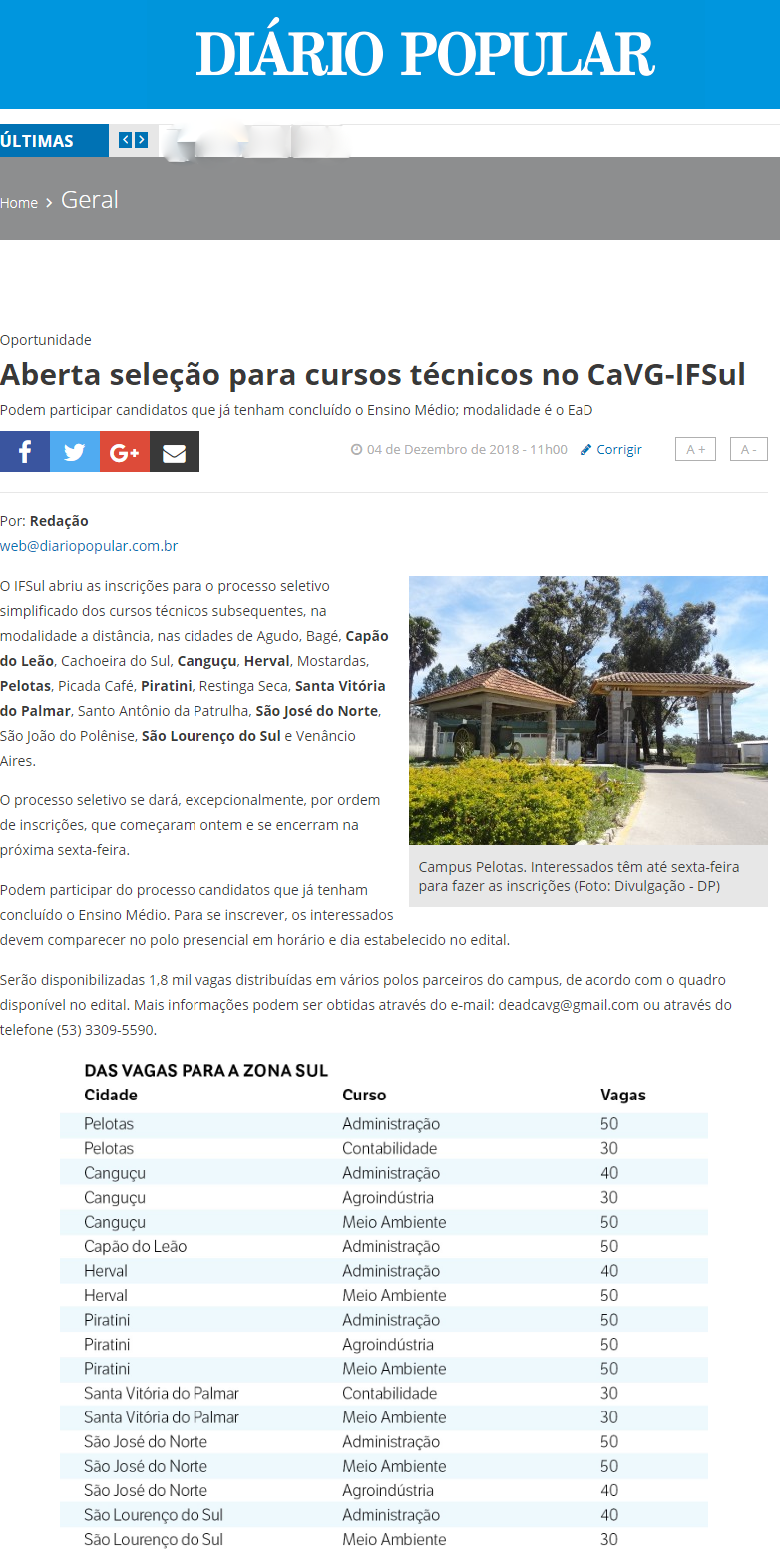Diário Popular - Aberta seleção para cursos técnicos no câmpus Pelotas-Visconde da Graça