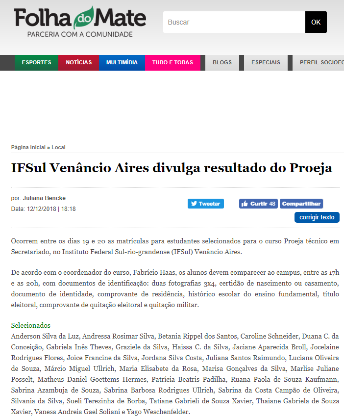 Folha do Mate - Câmpus Venâncio Aires do IFSul divulga resultado do Proeja
