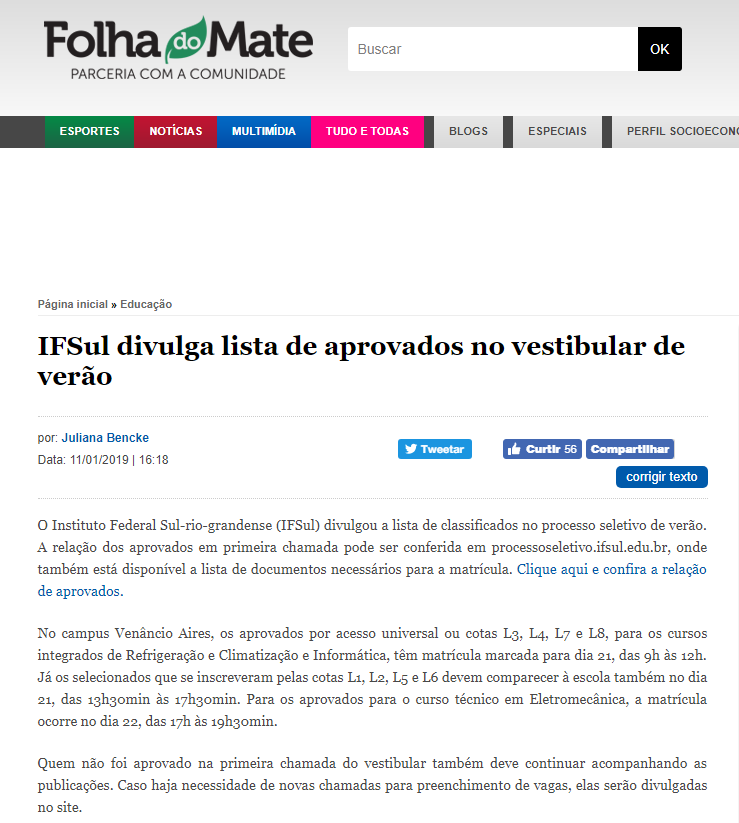 Folha do Mate - IFSul divulga lista de aprovados no vestibular de verão