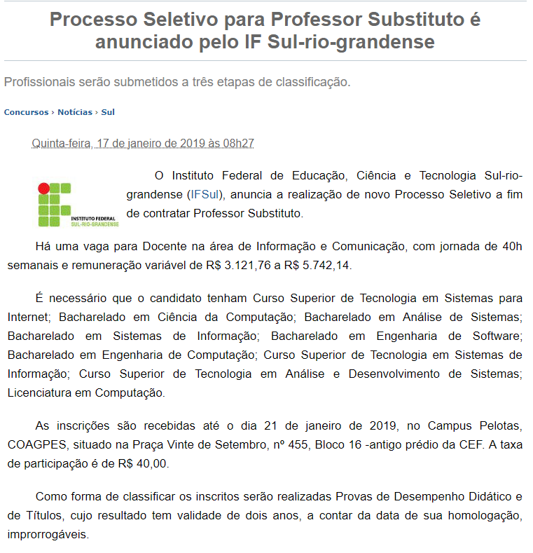 PCI Concursos - Processo seletivo para professor substituto é anunciado pelo IFSul