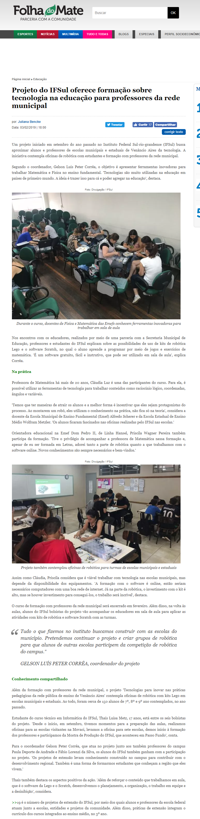 Folha do Mate - Projeto do IFSul oferece formação sobre tecnologia na educação para professores da rede municipal