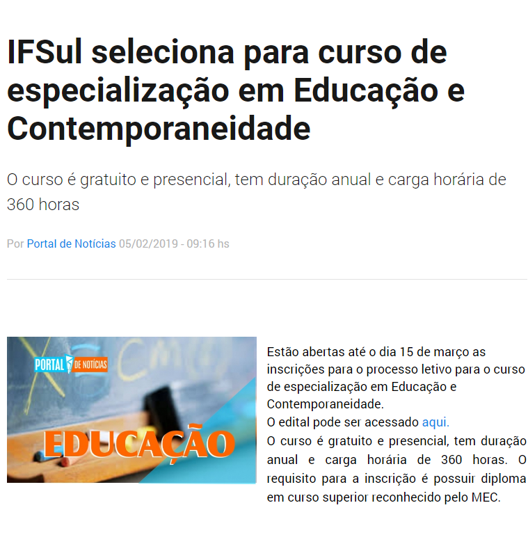 Portal de Notícias - IFSul seleciona para curso de especialização em Educação e Contemporaneidade