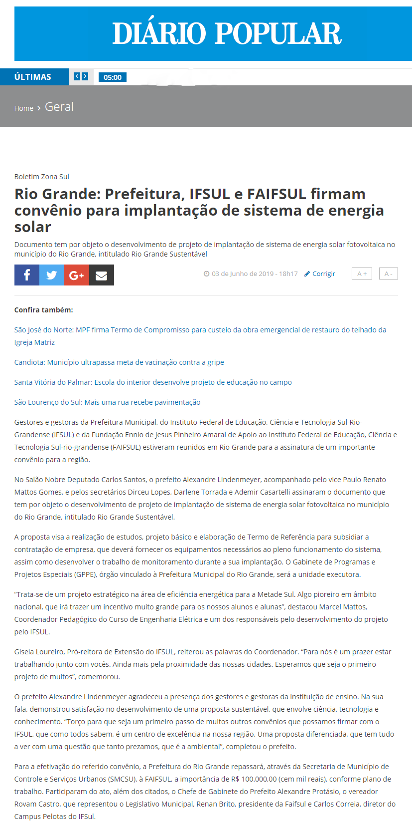 Diário Popular - Rio Grande: Prefeitura, IFSul e FAIFSul firmam convênio para implantação de sistema de energia solar