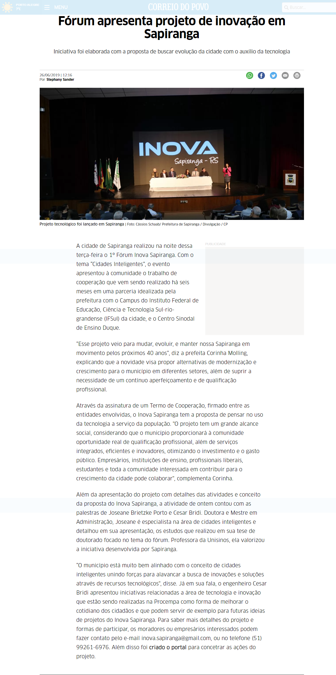 Correio do Povo - Fórum apresenta projeto de inovação em Sapiranga