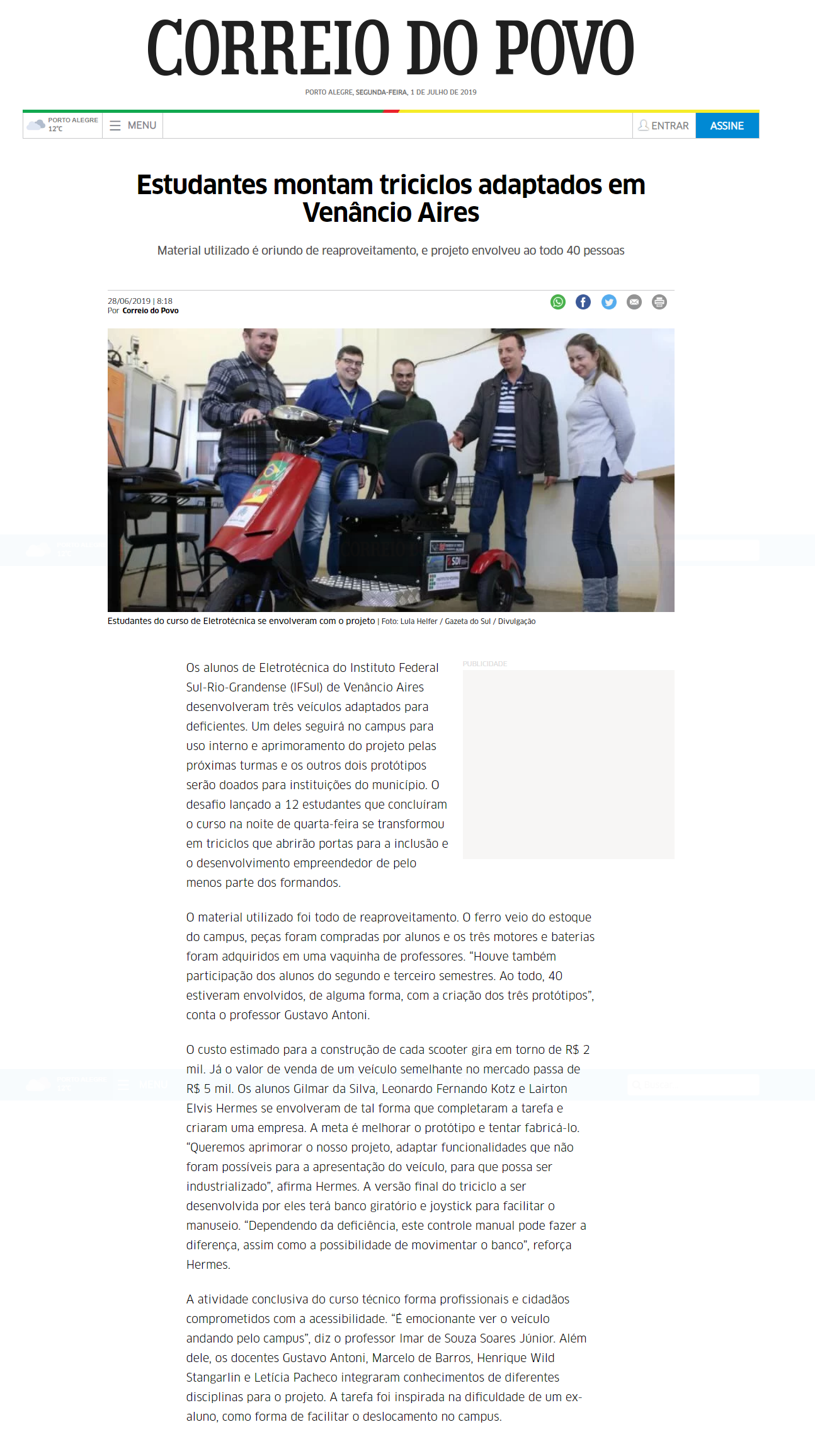 Correio do Povo - Estudantes montam triciclos adaptados em Venâncio Aires
