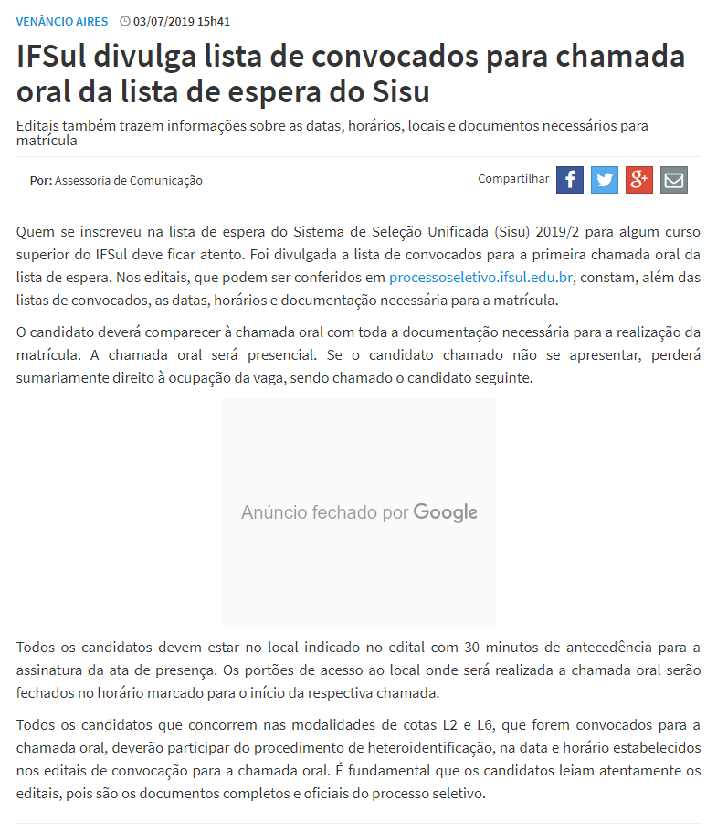 Gaz - IFSul divulga lista de convocados para chamada oral da lista de espera do Sisu