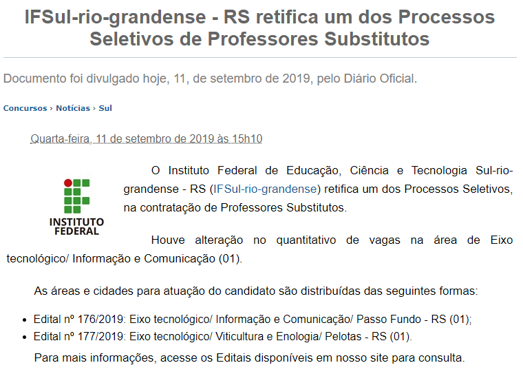PCI Concursos - IFSul-rio-grandense retifica um dos processos seletivos de professores substitutos