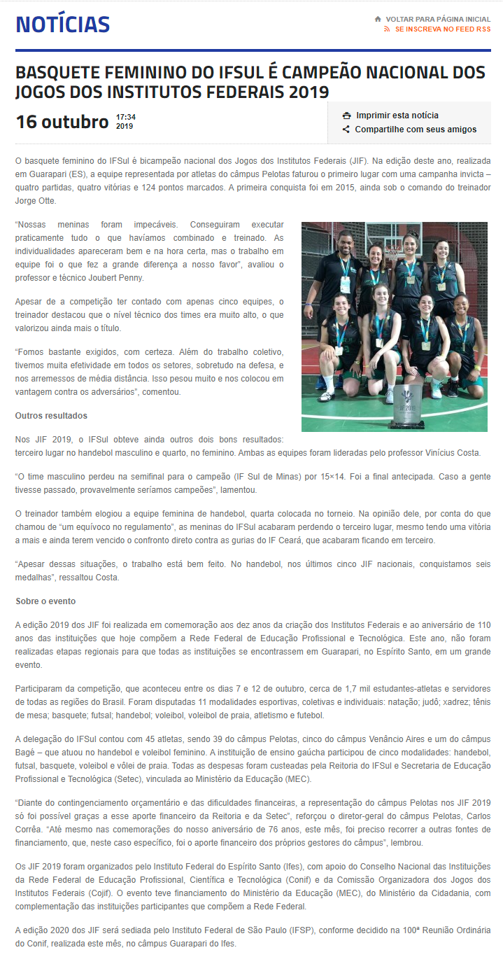 DIário da Manhã - Basquete feminino do IFSul é campeão nacional dos jogos dos institutos federais 2019