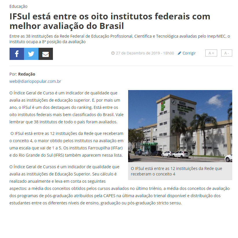 Diário Popular - IFSul está entre os oito institutos federais com melhor avaliação do Brasil no ensino superior
