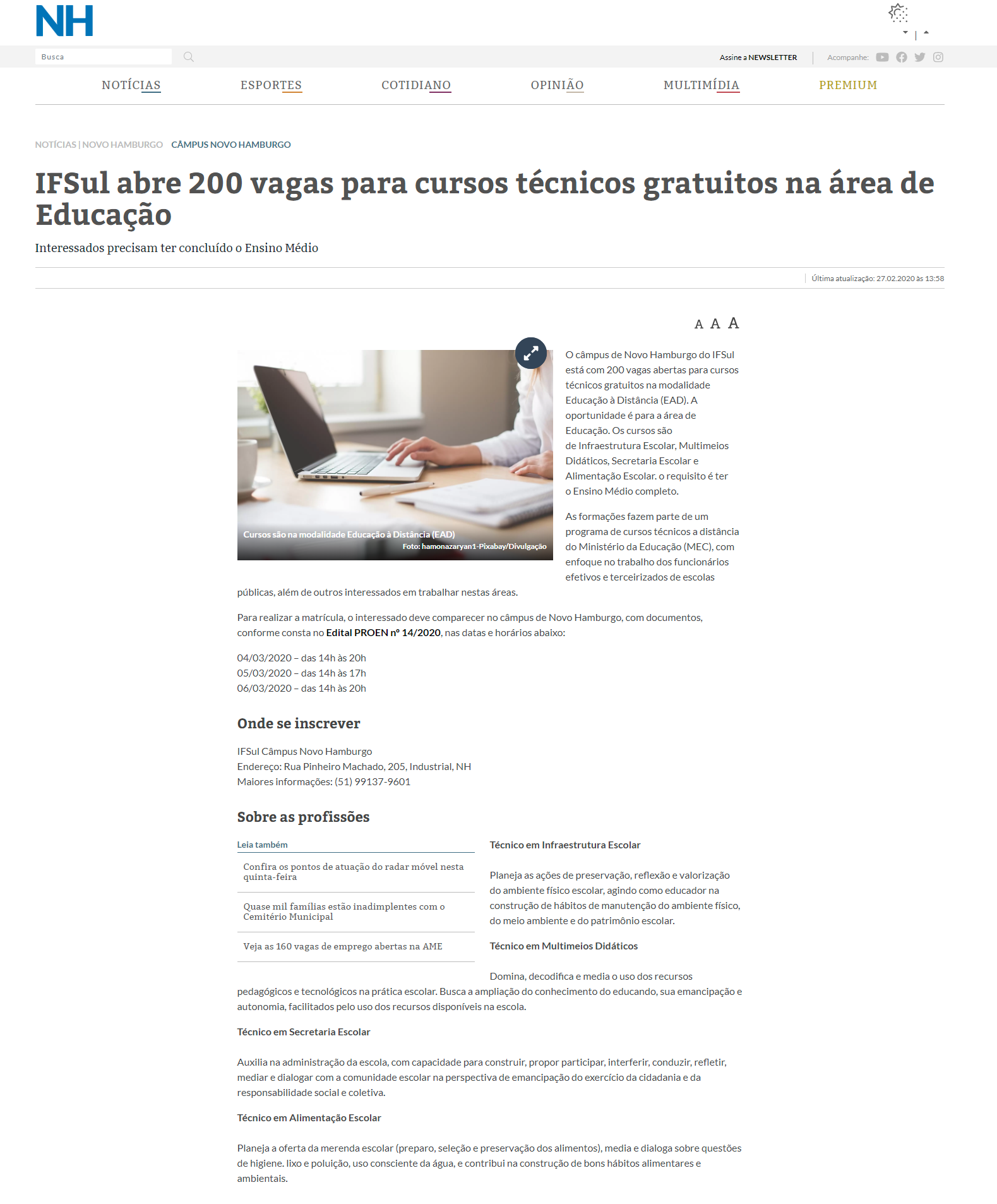 Jornal NH - IFSul abre 200 vagas para cursos técnicos gratuitos na área de Educação