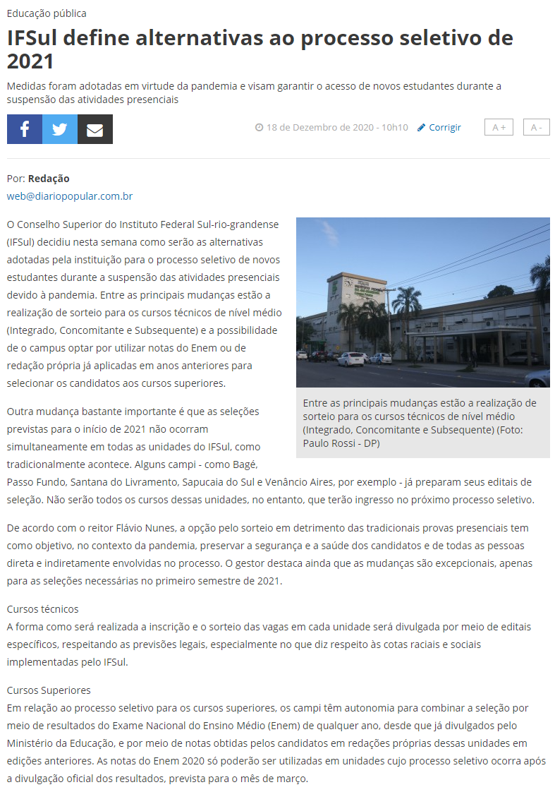 Diário Popular - IFSul define alternativas ao processo seletivo de 2021