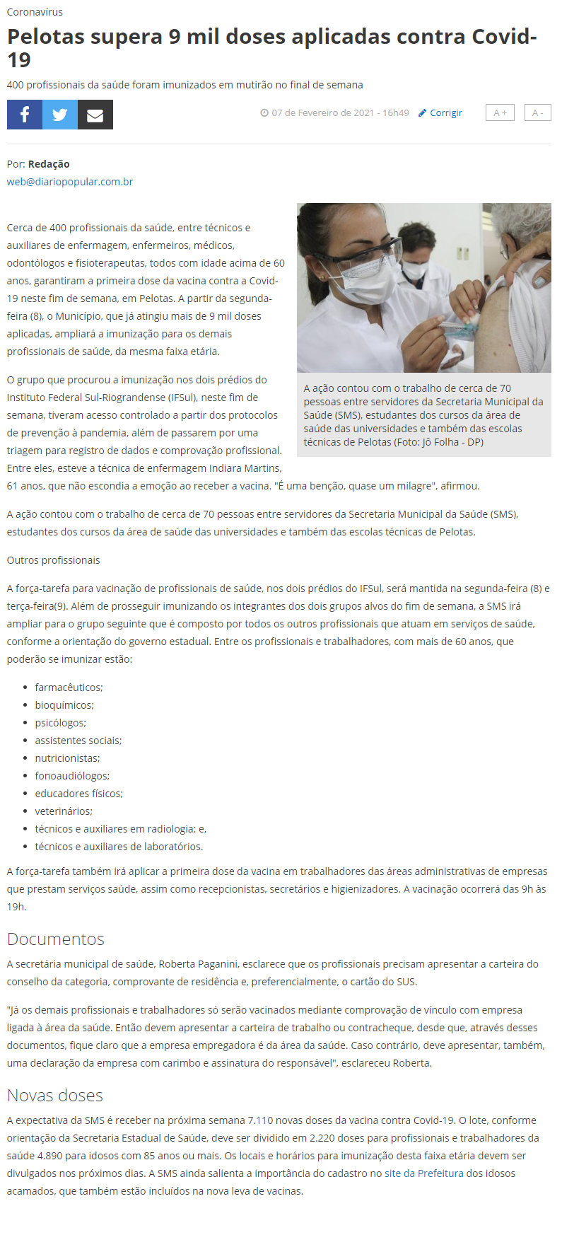 Diário Popular - Pelotas supera 9 mil doses aplicadas contra Covid-19