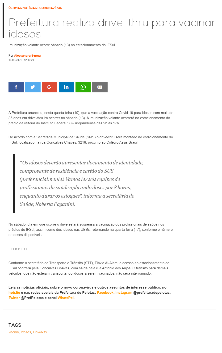 Prefeitura de Pelotas - Prefeitura realiza drive-thru para vacinar idosos