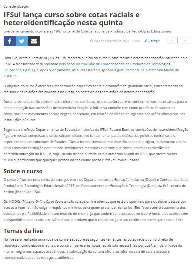 Diário Popular - IFSul lança curso sobre cotas raciais e heteroidentificação nesta quinta