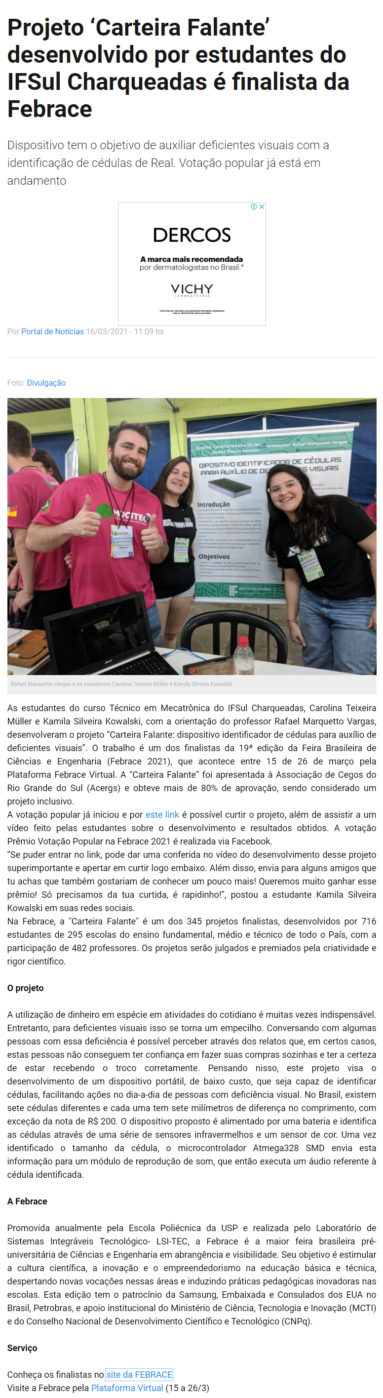 Portal de Notícias - Projeto "Carteira Falante" desenvolvido por estudantes do IFSul Charqueadas é finalista da Febrace