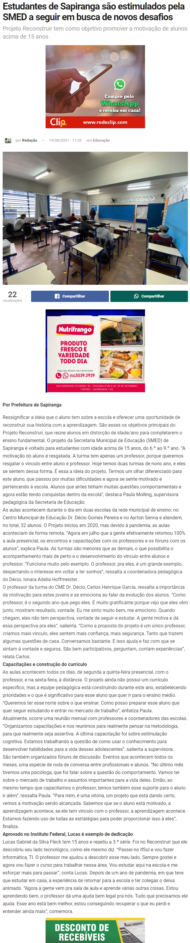 Jornal Repercussão - Estudantes de Sapiranga são estimulados pela Smed a seguir em busca de novos desafios