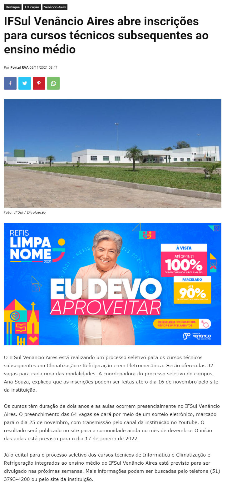 Portal RVA - IFSul Venâncio Aires abre inscrições para cursos técnicos subsequentes ao ensino médio