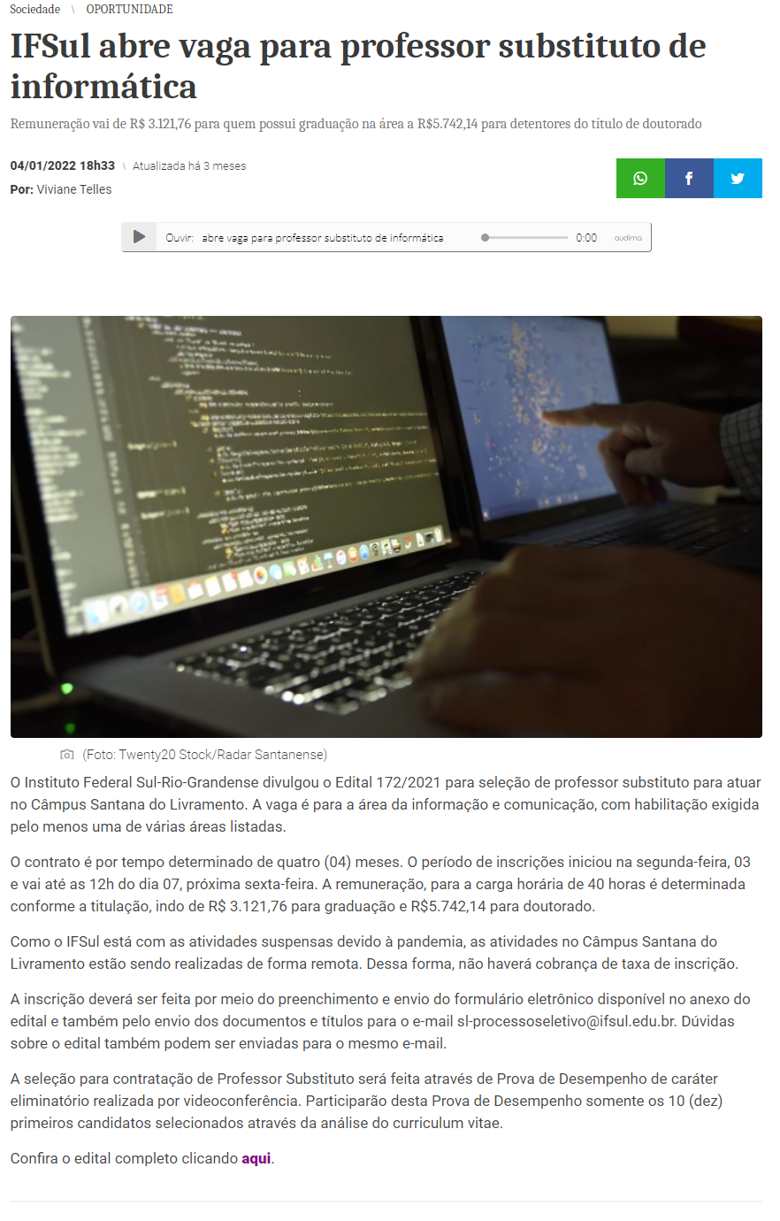 Radar Santanense - IFSul abre vaga para professor substituto de informática