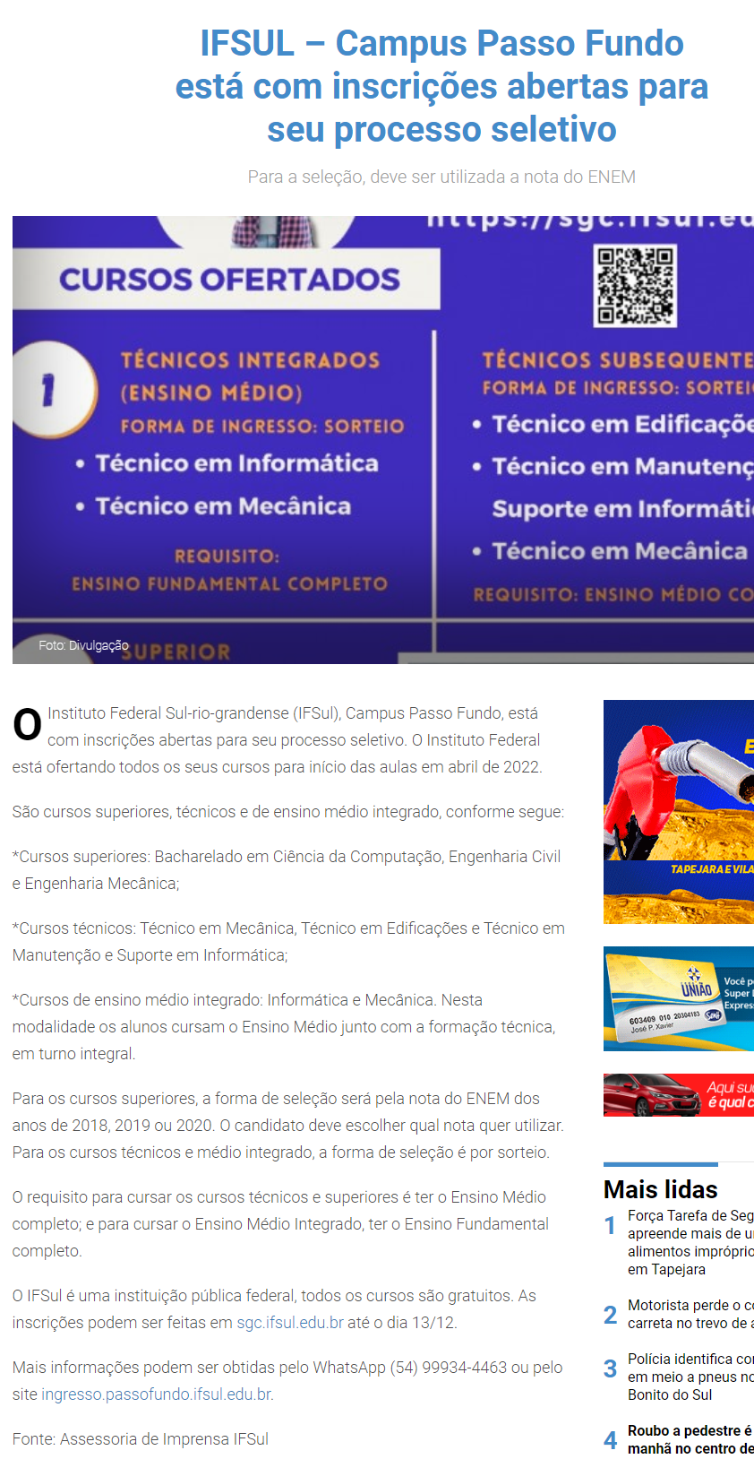 Rádo Tapejara FM - IFSUL - Campus Passo Fundo está com inscrições abertas para o seu processo seletivo