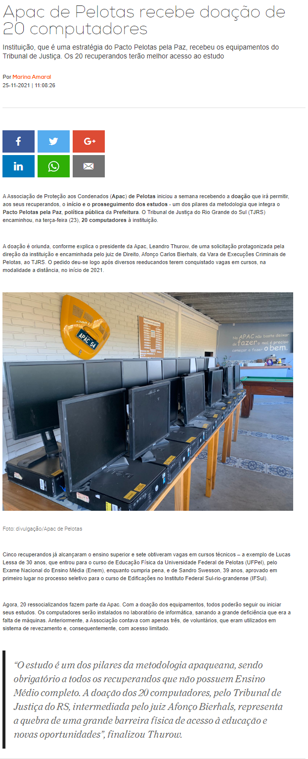 Prefeitura Municipal de Pelotas - Apac de Pelotas recebe doação de 20 computadores