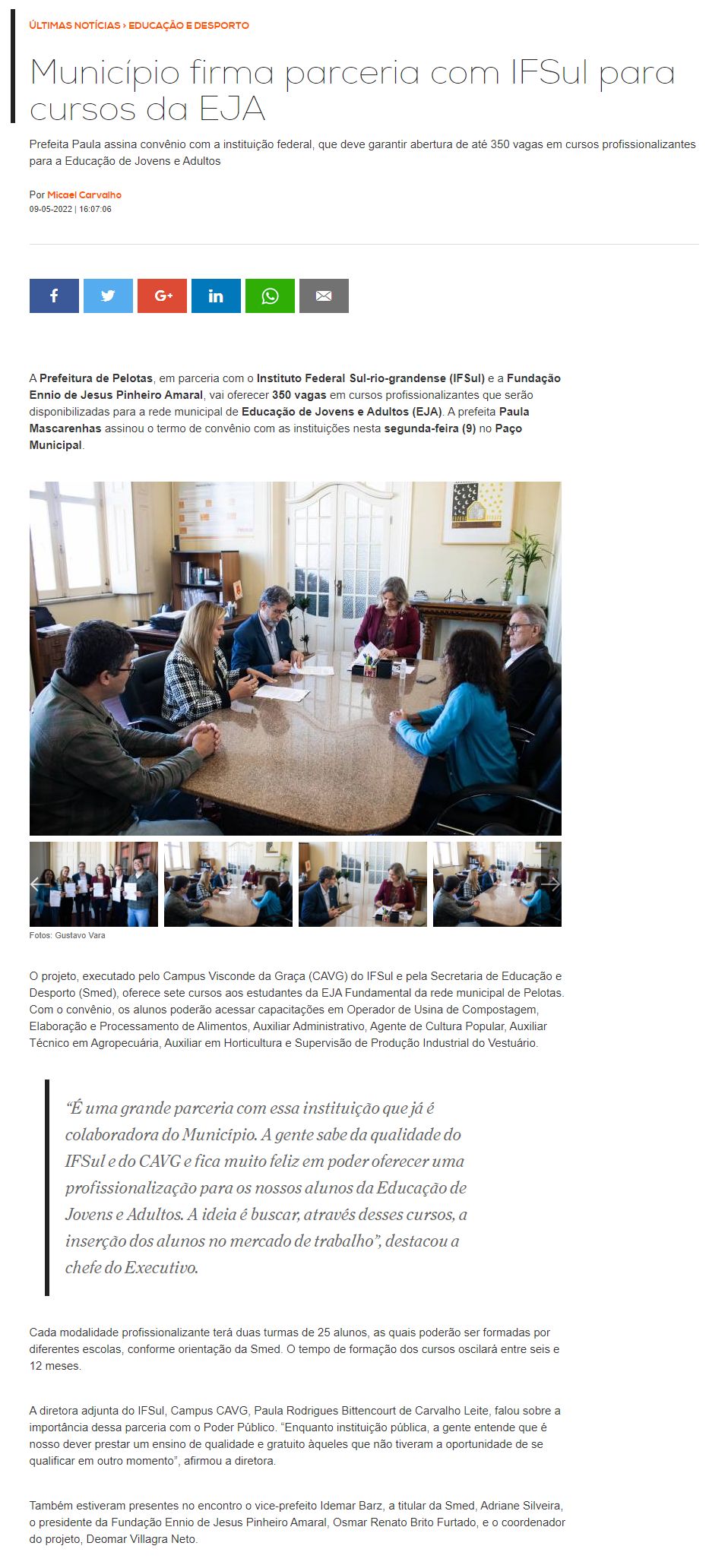 Prefeitura de Pelotas - Município firma parceria com IFSul para cursos da EJA