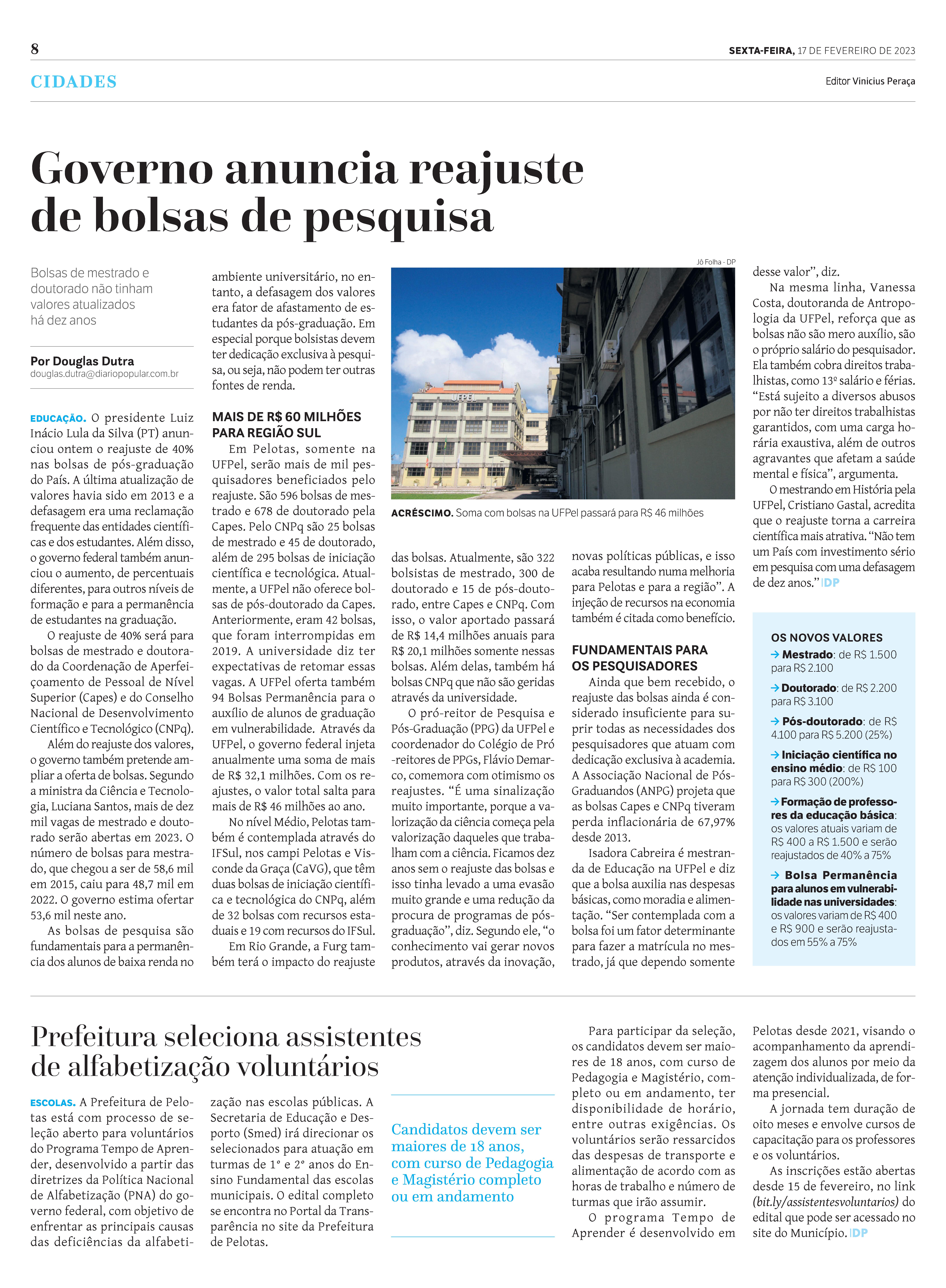Diário Popular - Governo federal anuncia reajuste de 40% em bolsas de pós-graduação