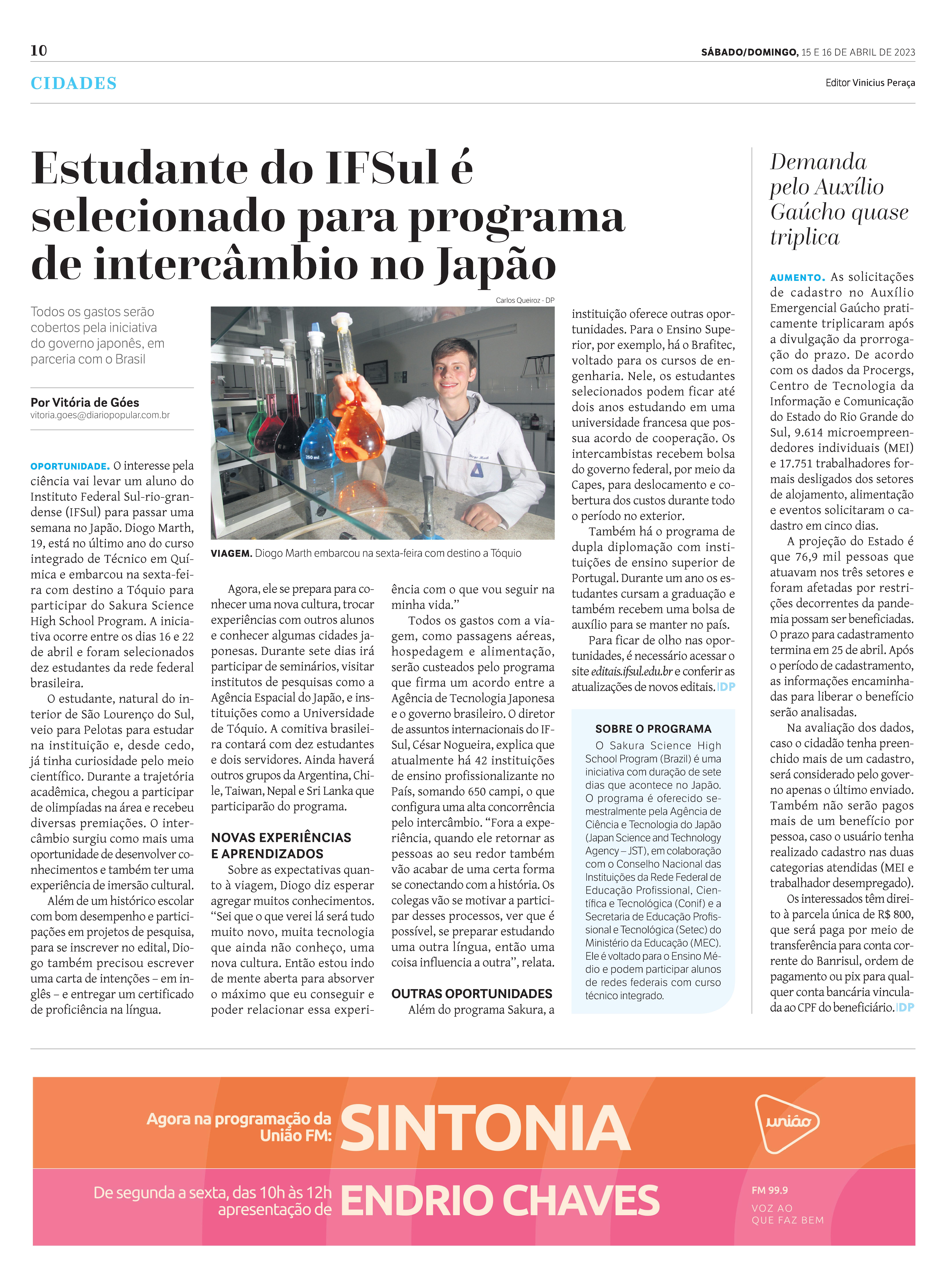 Diário Popular - Estudante do IFSul é selecionado para programa de intercâmbio no Japão (impresso)