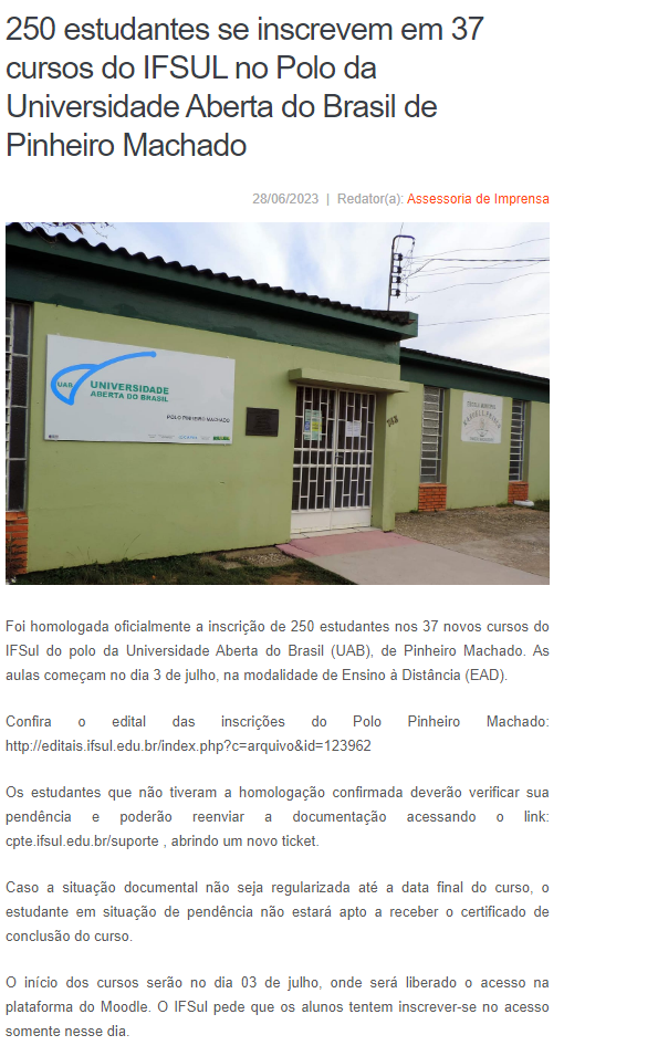 Prefeitura de Pinheiro Machado - 250 estudantes se inscrevem em 37 cursos do IFSUL no Polo da Universidade Aberta do Brasil