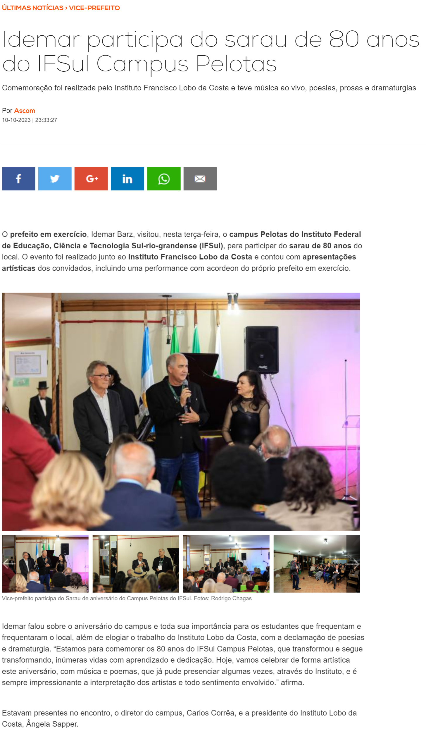 Site Prefeitura de Pelotas - Idemar participa do sarau de 80 anos do IFSul Campus Pelotas