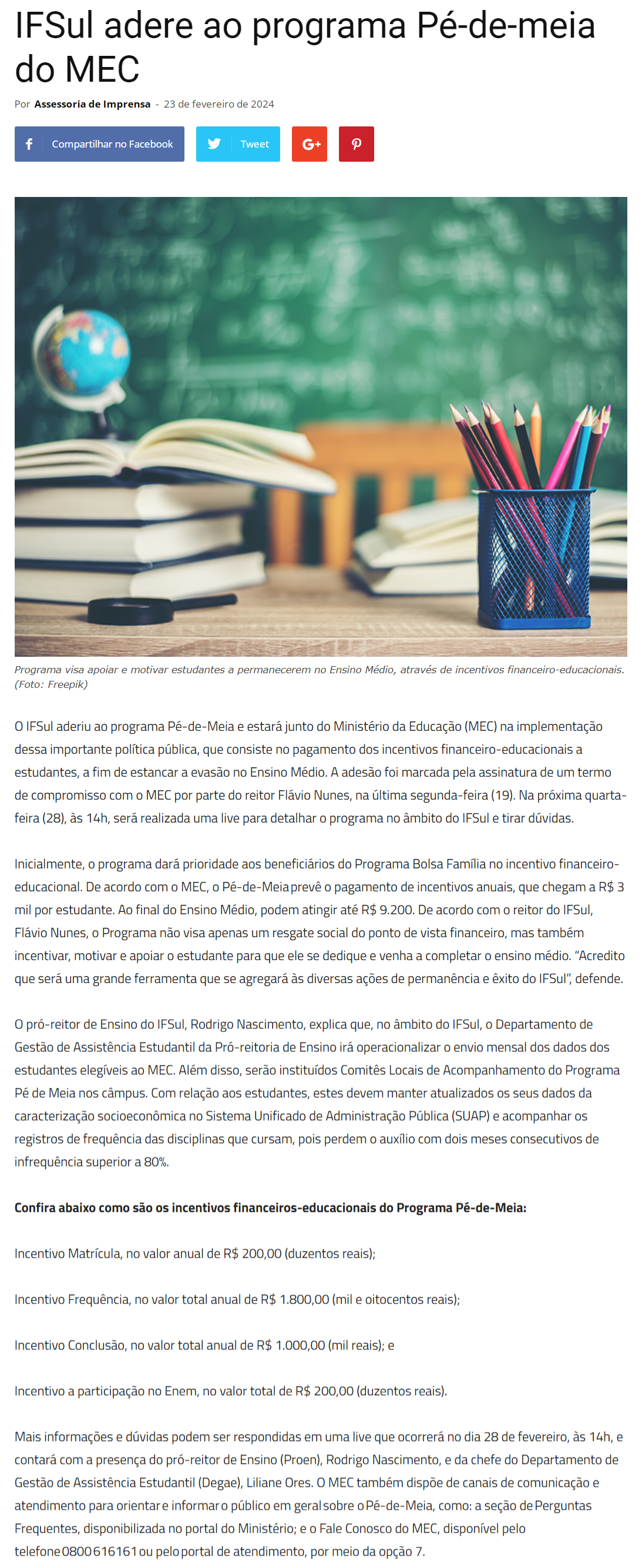 Jornal Tradição Regional - IFSul adere ao programa Pé-de-meia do MEC