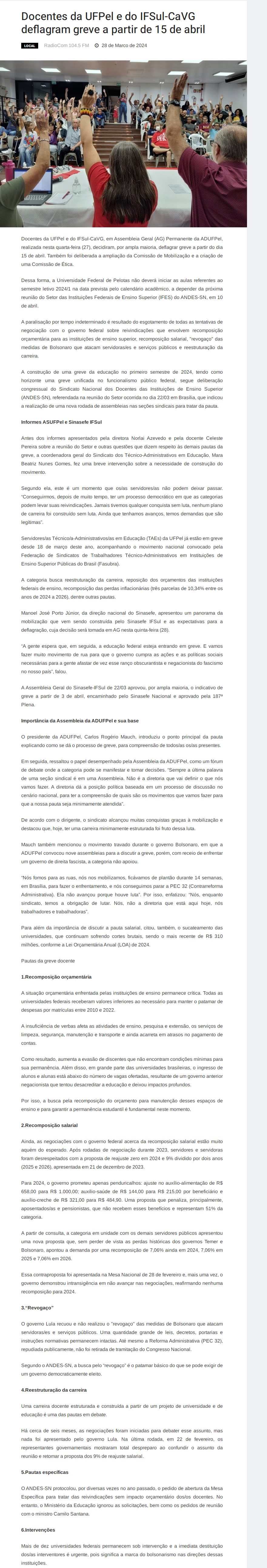 Radio Com - Docentes da UFPel e do IFSul-CaVG deflagram greve a partir de 15 de abril