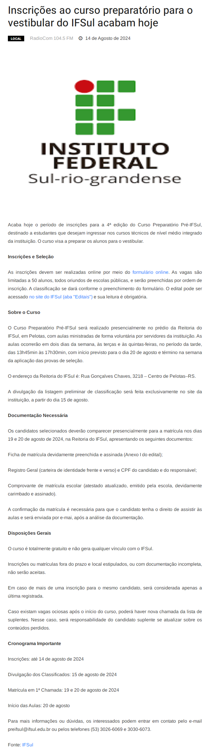 Rádio Com - Inscrições ao curso preparatório para o vestibular do IFSul acabam hoje